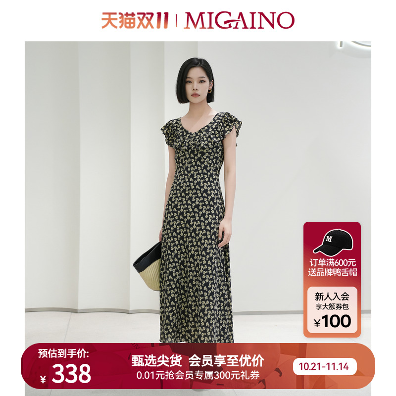 Migaino曼娅奴女装秋季新款法式气质显瘦雪纺碎花裙中长款茶歇裙