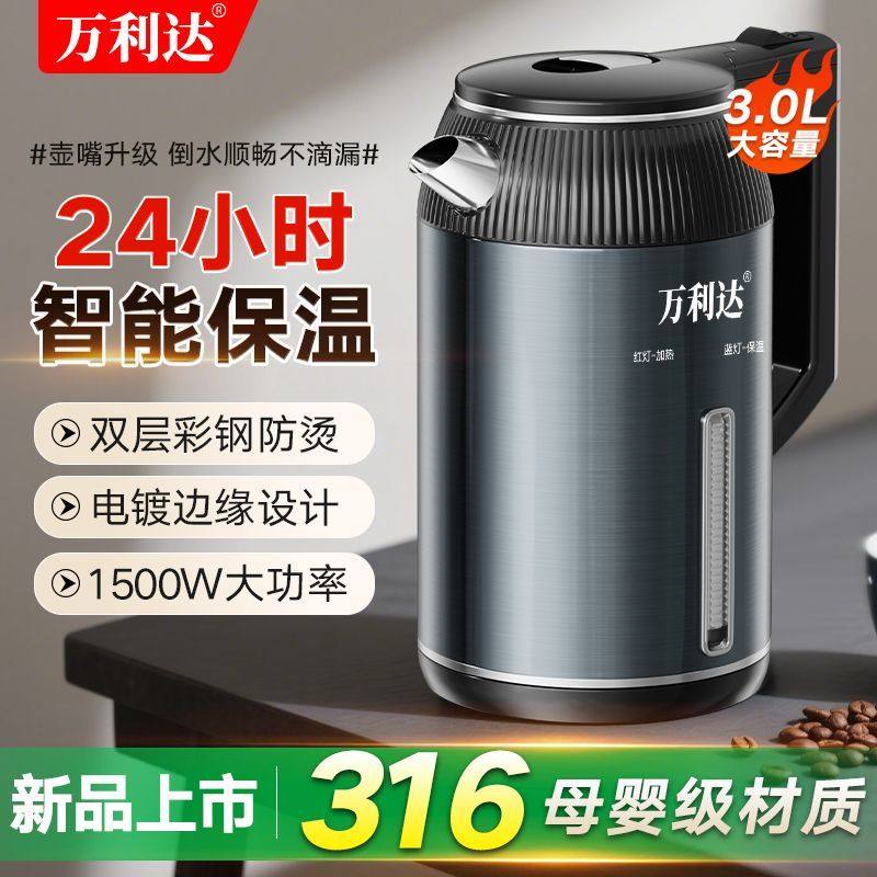 万利达316不锈钢电热水壶3L容量一体智能保温家用烧水壶快速沸腾