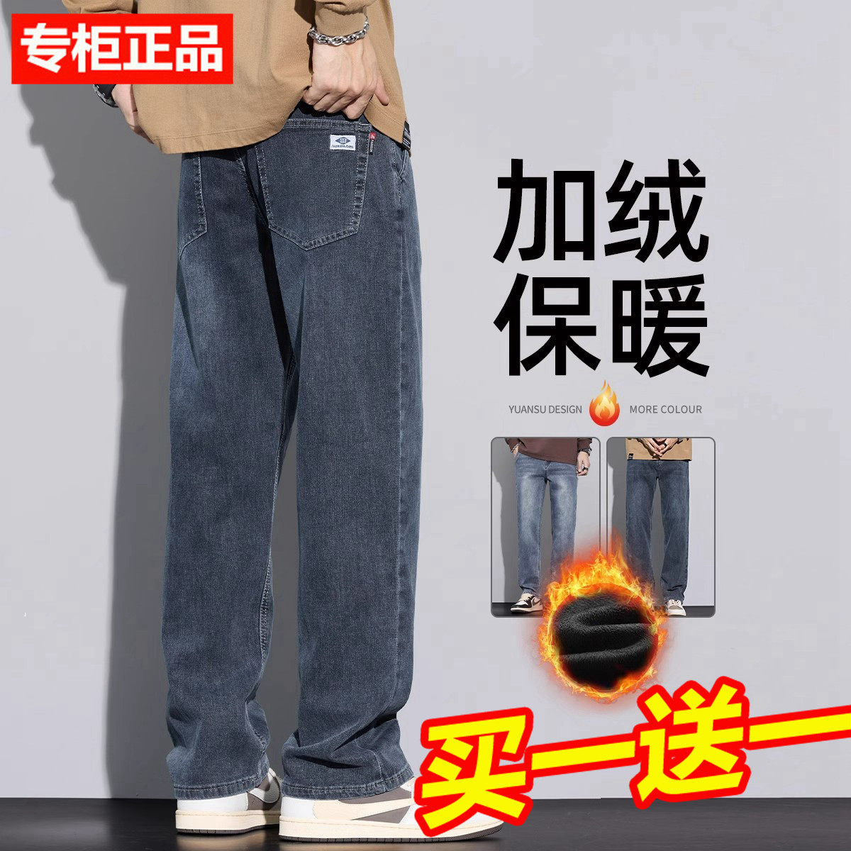 Yishion以纯官方时尚正品牛仔裤男款秋冬款加绒加厚宽松直筒男裤2