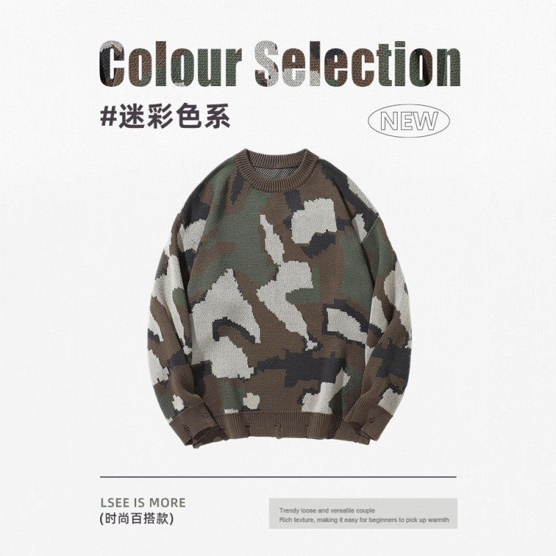 LABT迷彩破洞圆领毛衣男秋冬新款美式休闲宽松针织上衣男女同款潮