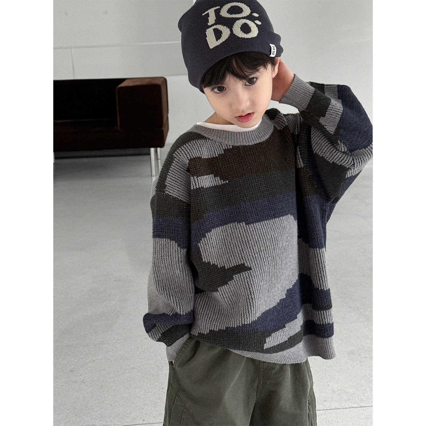 新款男童女童2025秋冬时尚撞色迷彩提花休闲宽松套头针织毛衣百搭