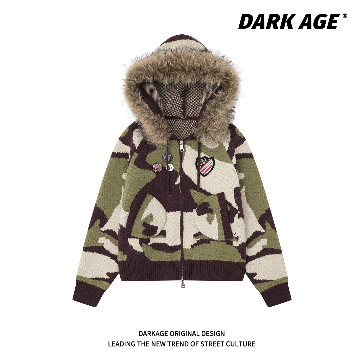 DARKAGE原创美式迷彩可拆卸毛领连帽毛衣女款修身显瘦短款针织衫