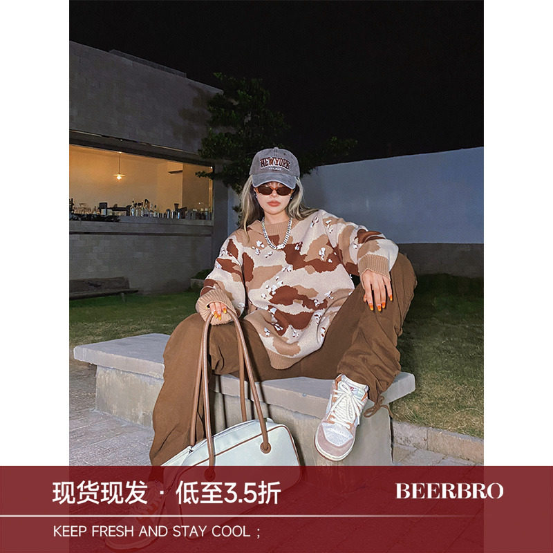 BeerBro美式迷彩圆领毛衣女秋冬宽松欧美复古慵懒风针织衫上衣潮