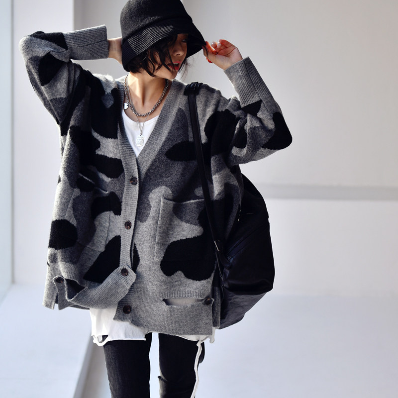 W3663C 文艺宽松简约个性迷彩织花宽松V领破洞毛衣开衫女米兰宣言