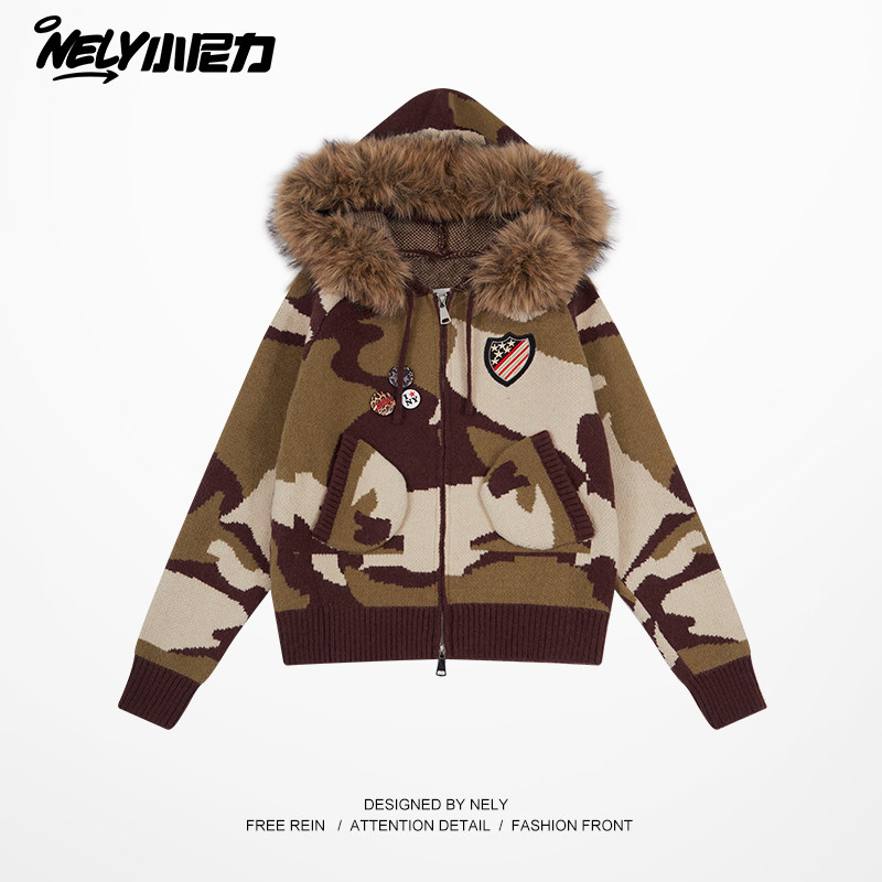 小尼力座山雕毛领连帽开衫毛衣女秋冬氛围感复古迷彩针织衫外套潮