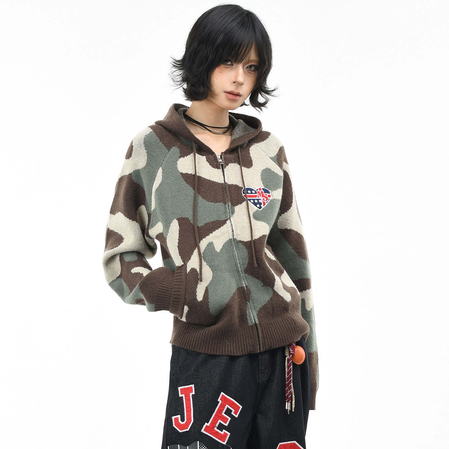 迷彩荷尔蒙连帽拉链针织衫美式复古轻奢重磅迷彩毛衣男女同款在售