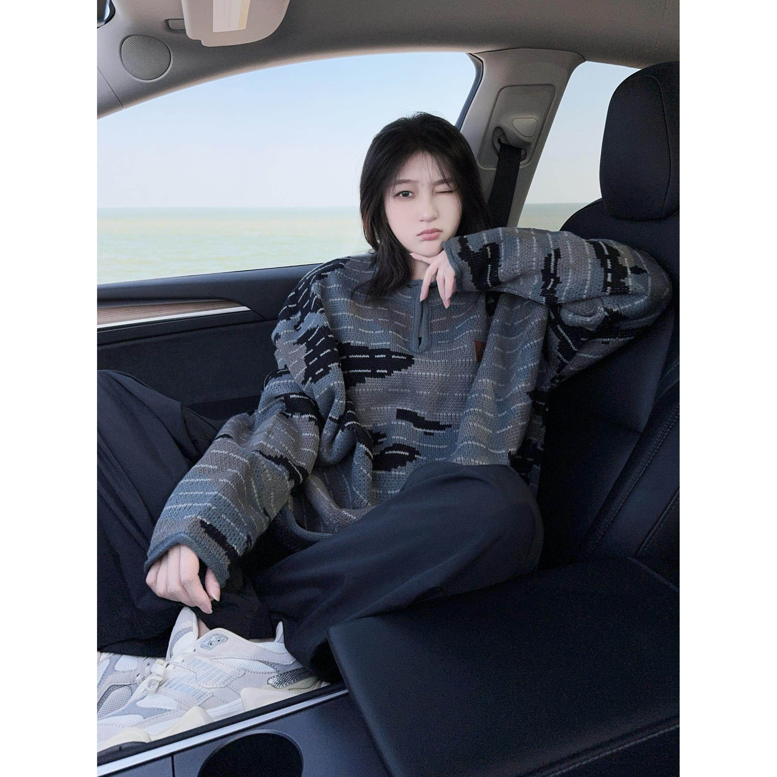 BeerBro 美式街头宽松慵懒迷彩羊毛毛衣女秋冬宽松显瘦连帽外套