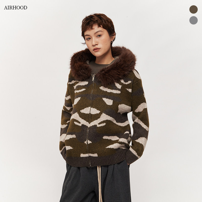 AIRHOOD 2025美式复古毛领迷彩针织衫女宽松情侣秋冬开衫毛衣外套