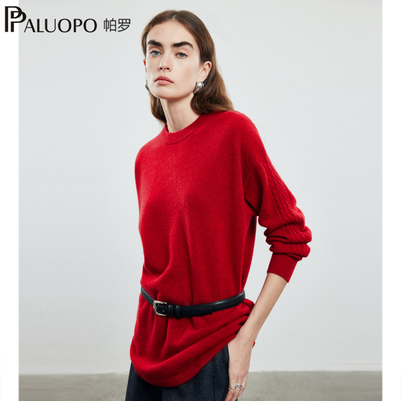 秋冬羊绒毛衣新款女装圆领扭花后背迷彩长袖套头加厚毛衫直筒休闲