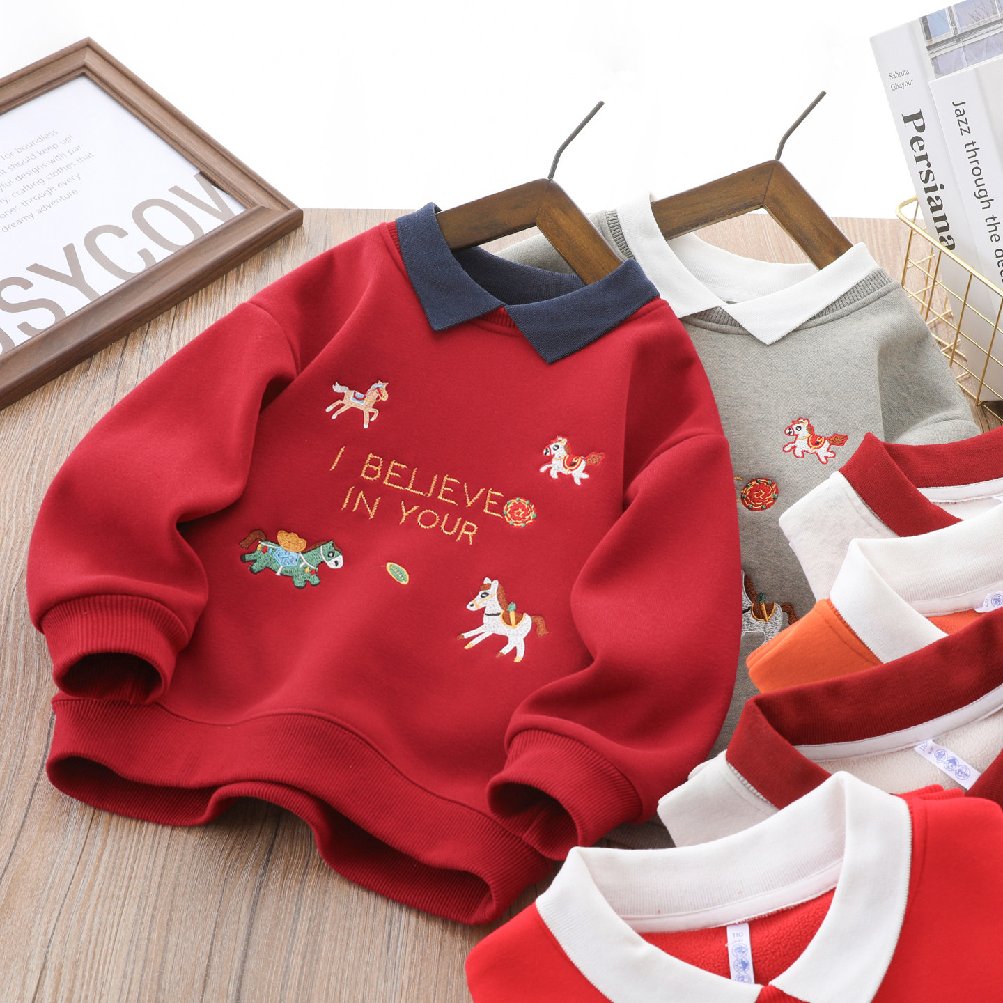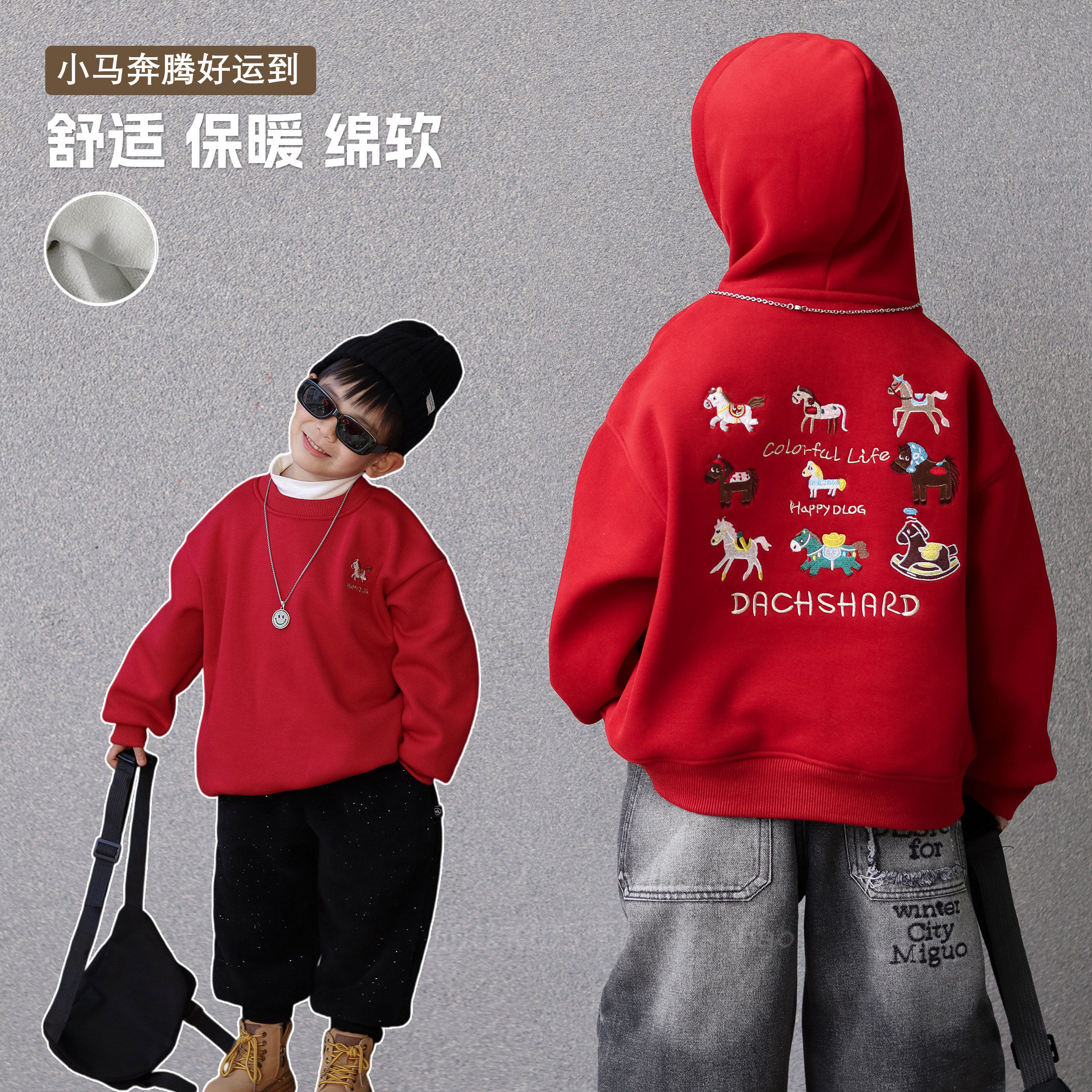 男童红色新年连帽卫衣秋冬款加绒加厚刺绣小马中大童儿童过年上衣