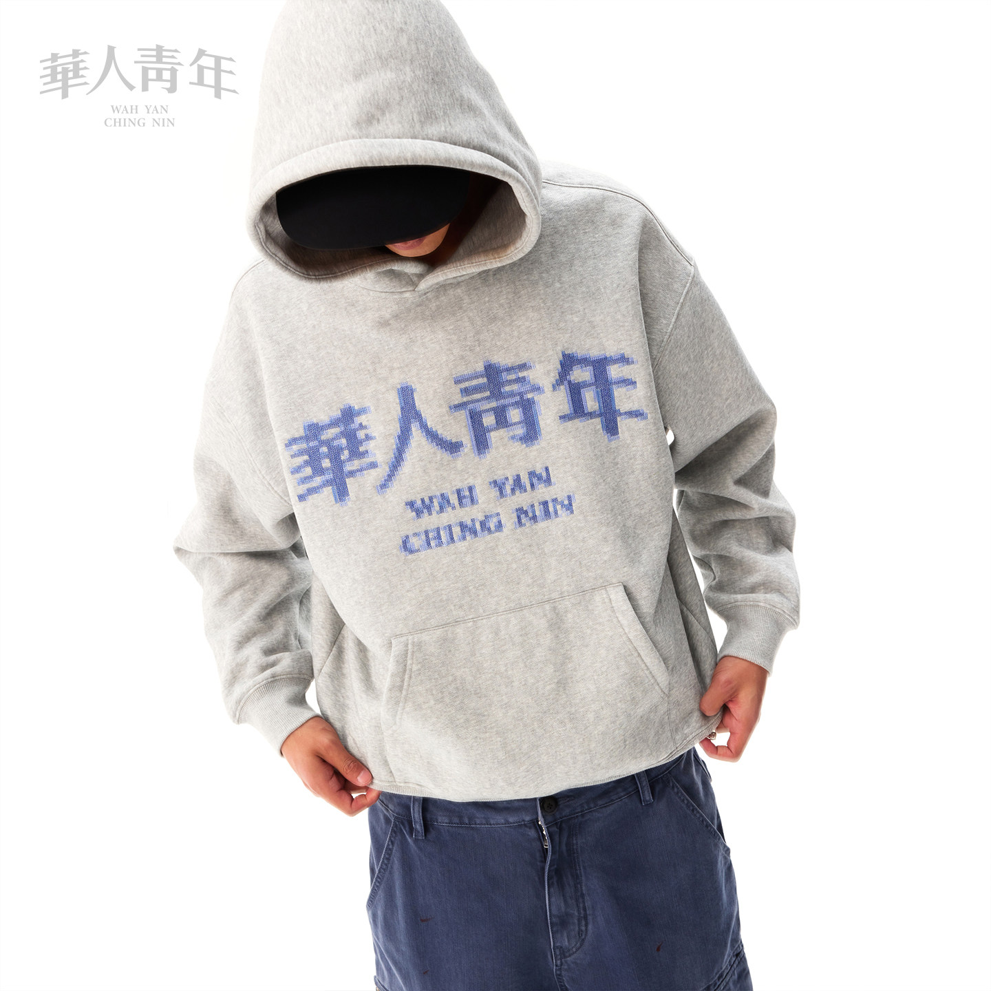 华人青年秋冬新款马赛克刺绣LOGO加绒帽衫男女同款休闲连帽卫衣潮