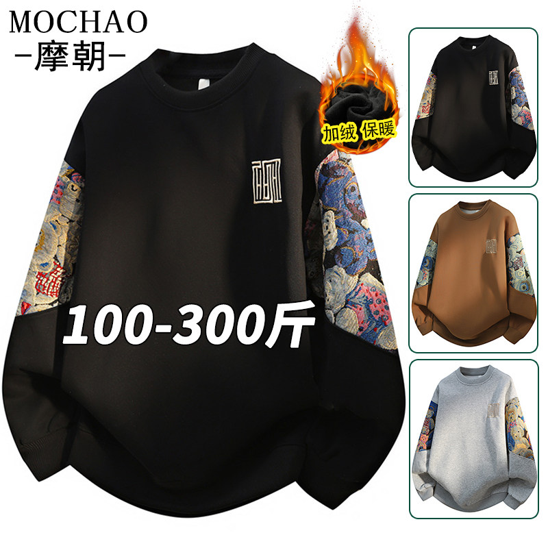 摩朝国潮刺绣拼接圆领卫衣男士秋冬新款加绒加厚保暖宽松大码上衣