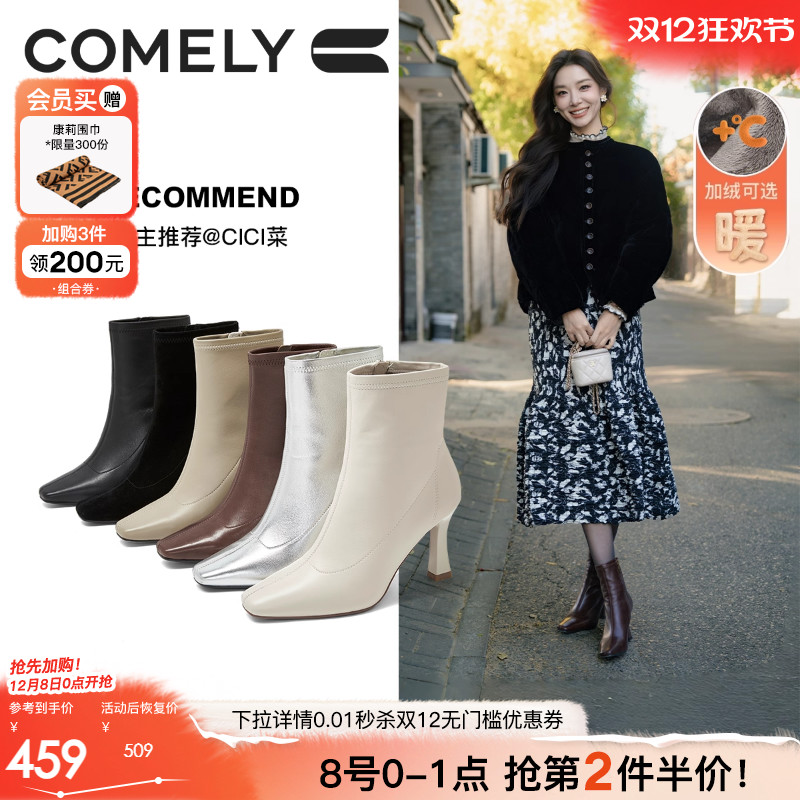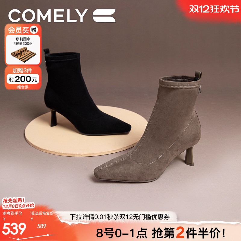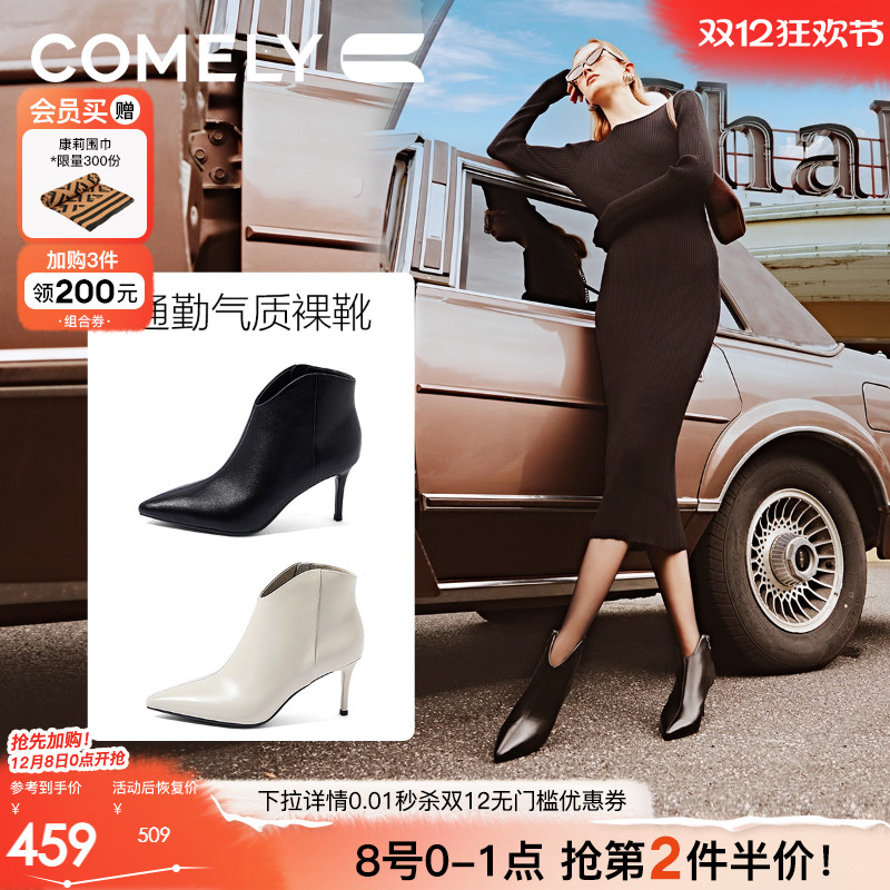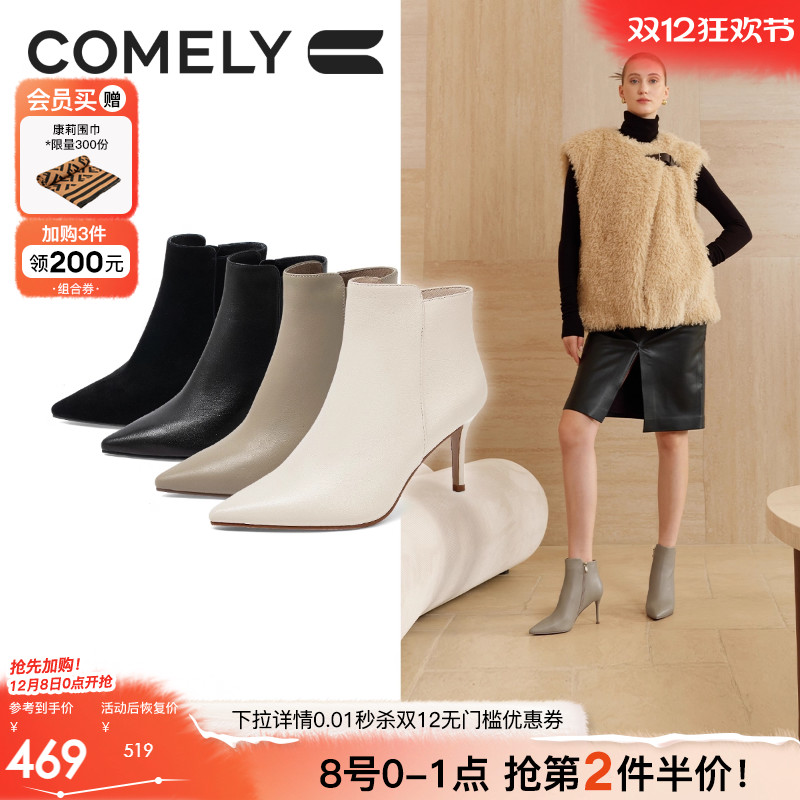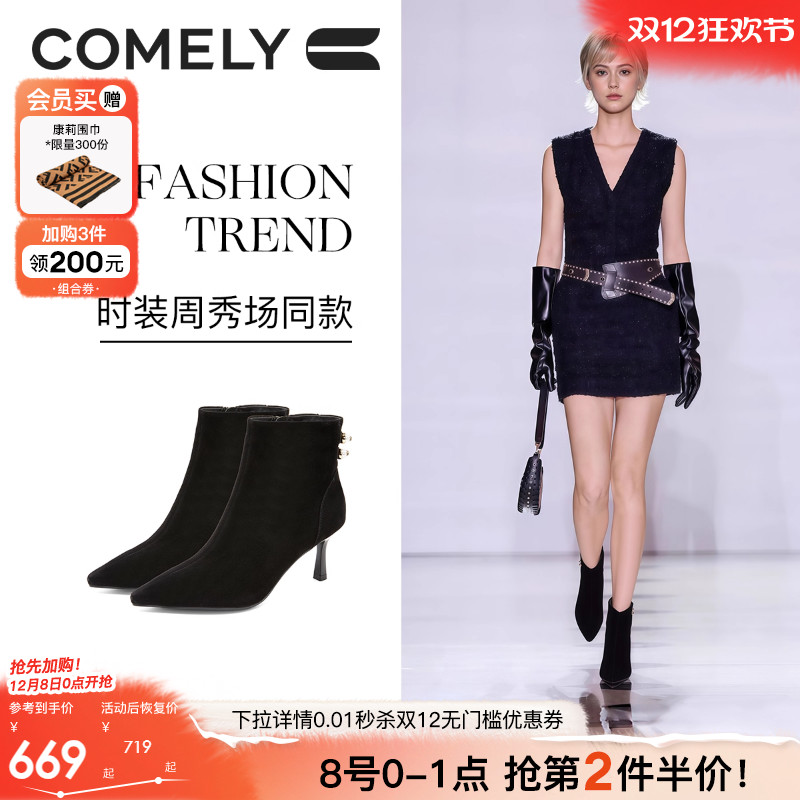 康莉细跟时装靴女2025冬季新款绒面高跟短靴羊皮小裸靴商场同款
