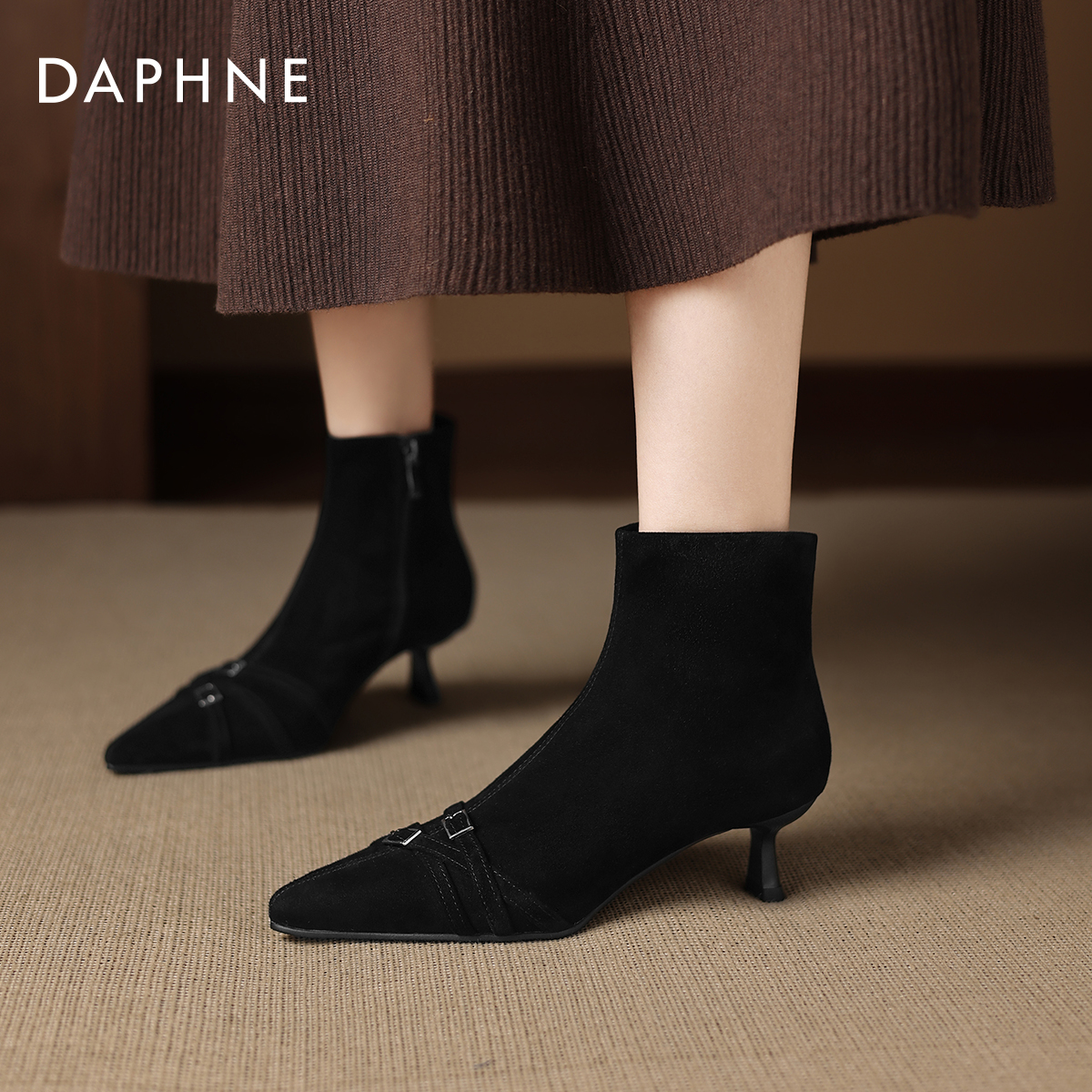 达芙妮气质高跟短靴女冬季2025新款细跟袜靴法式瘦瘦靴绒面马丁靴