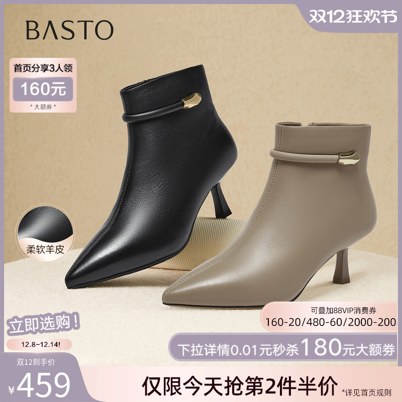 百思图2025冬季商场新款气质羊皮及踝靴尖头细跟女短靴K5035DD5