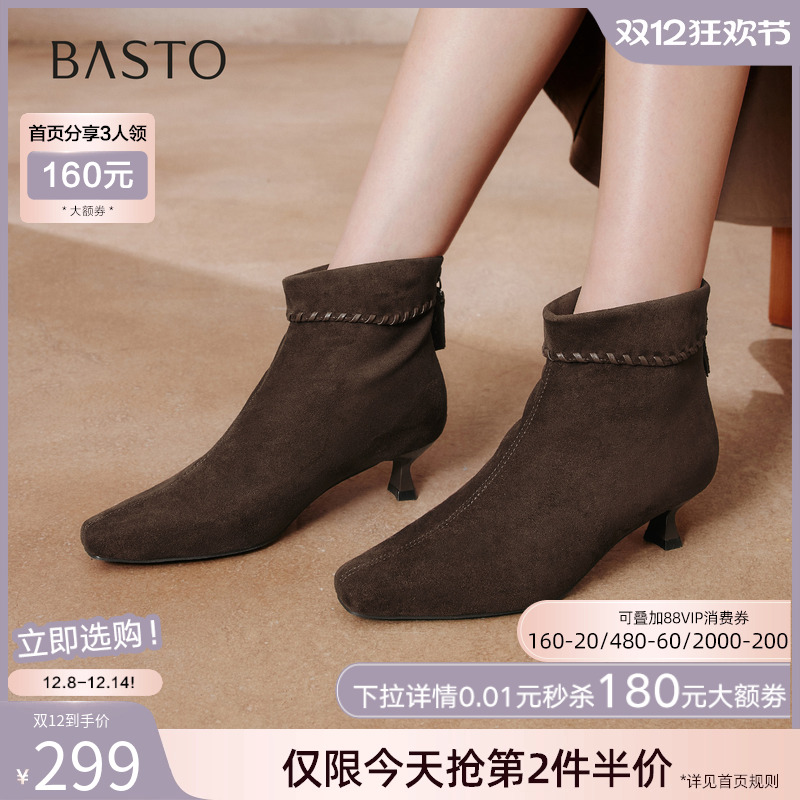 百思图2025冬季新款气质通勤细跟小踝靴尖头绒面女短靴W0131DD5