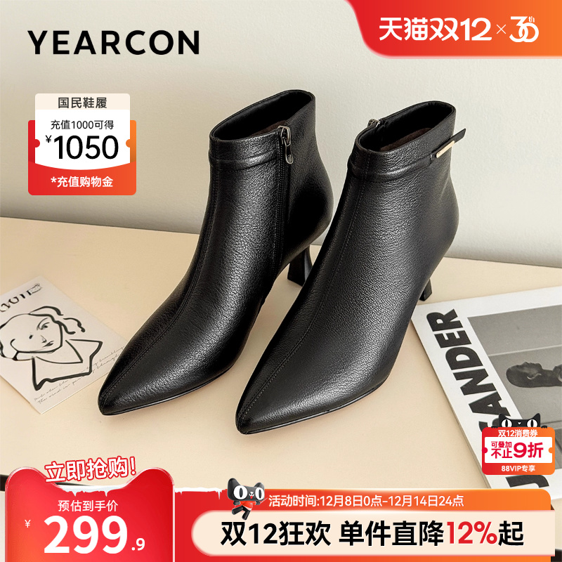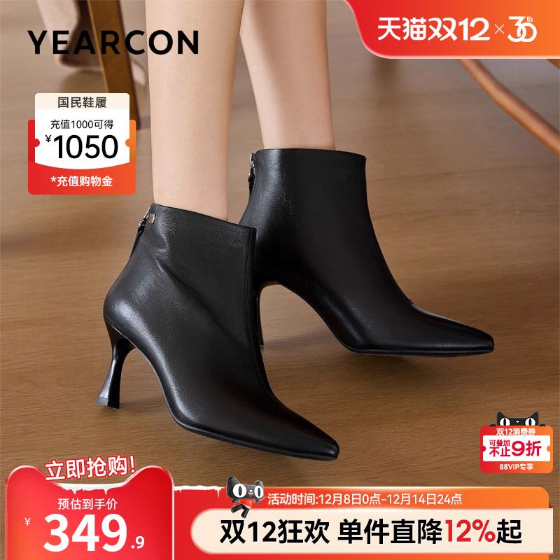 意尔康女鞋冬季真皮加绒短靴羊皮尖头细跟法式气质及踝靴女士皮鞋