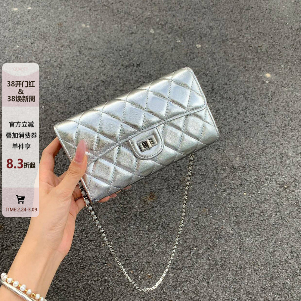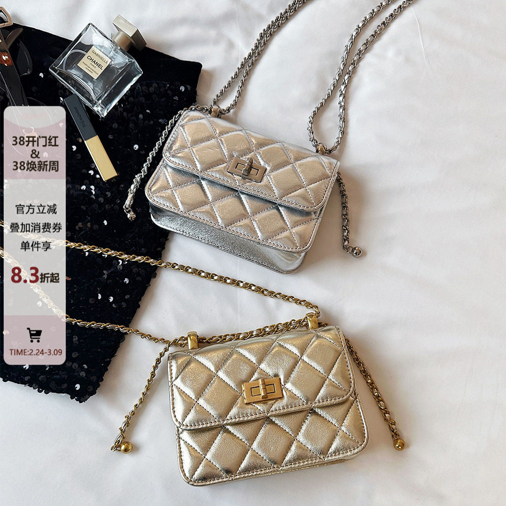 小香风银色小方包女高级感手机包迷你小包真皮单肩斜挎菱格链条包
