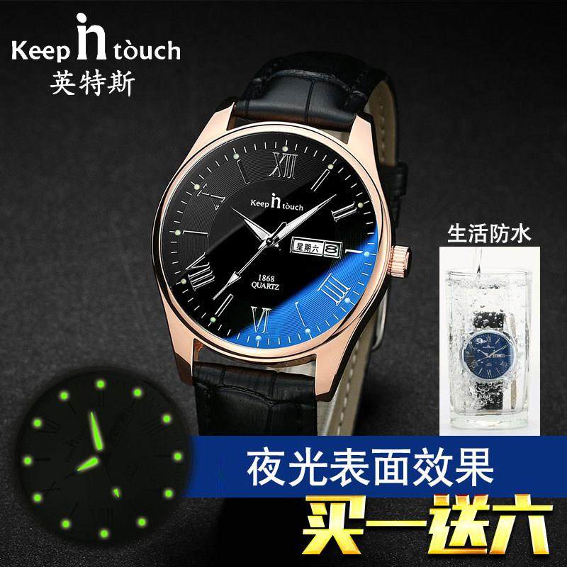 手表男机械石英表夜光防水真皮带潮流双日历学生正品瑞士休闲时尚