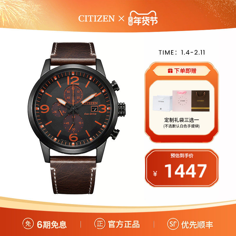 西铁城光动能手表男夜光防水网红骚橙皮带休闲男士手表BM8475-26E