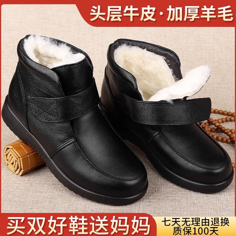 冬季妈妈鞋加绒真皮软底中老年人棉鞋女防滑老人皮鞋保暖羊毛鞋子