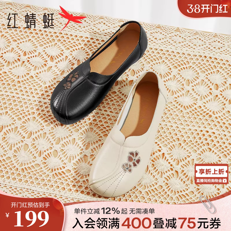 红蜻蜓女鞋春季复古刺绣平底休闲中年妈妈鞋防滑软底浅口老人皮鞋
