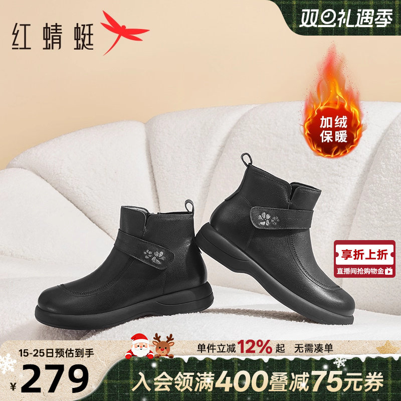 红蜻蜓真皮妈妈棉鞋冬季新款女鞋加绒保暖老人皮鞋女冬鞋中年短靴