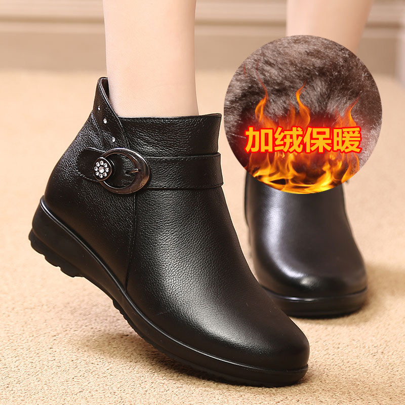冬天女鞋平底中老年女加绒短靴保暖真皮妈妈棉鞋软底防滑老人皮鞋