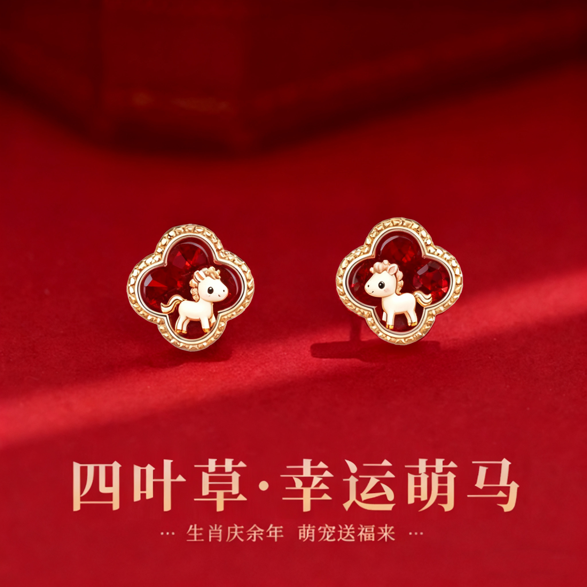 S925纯银四叶草红色耳钉女2026新款马年本命年耳环高级感新年耳饰