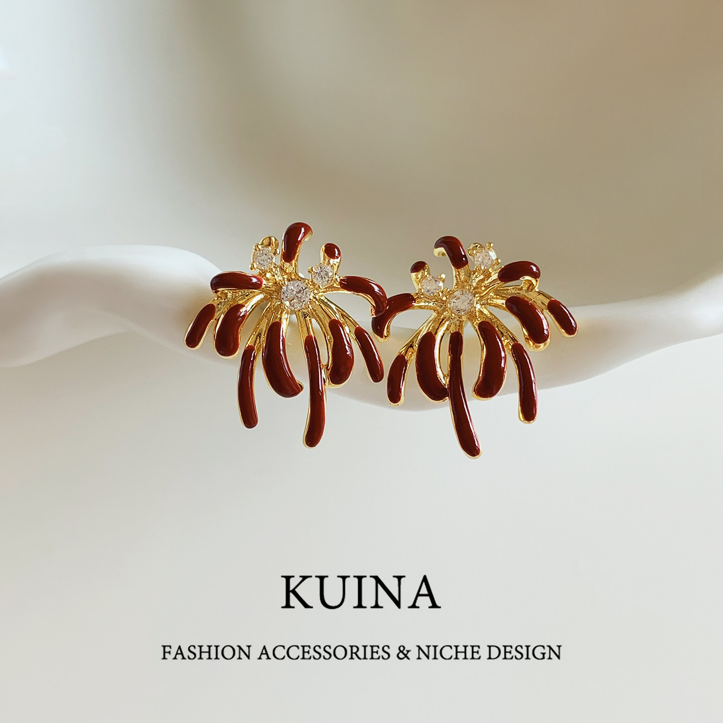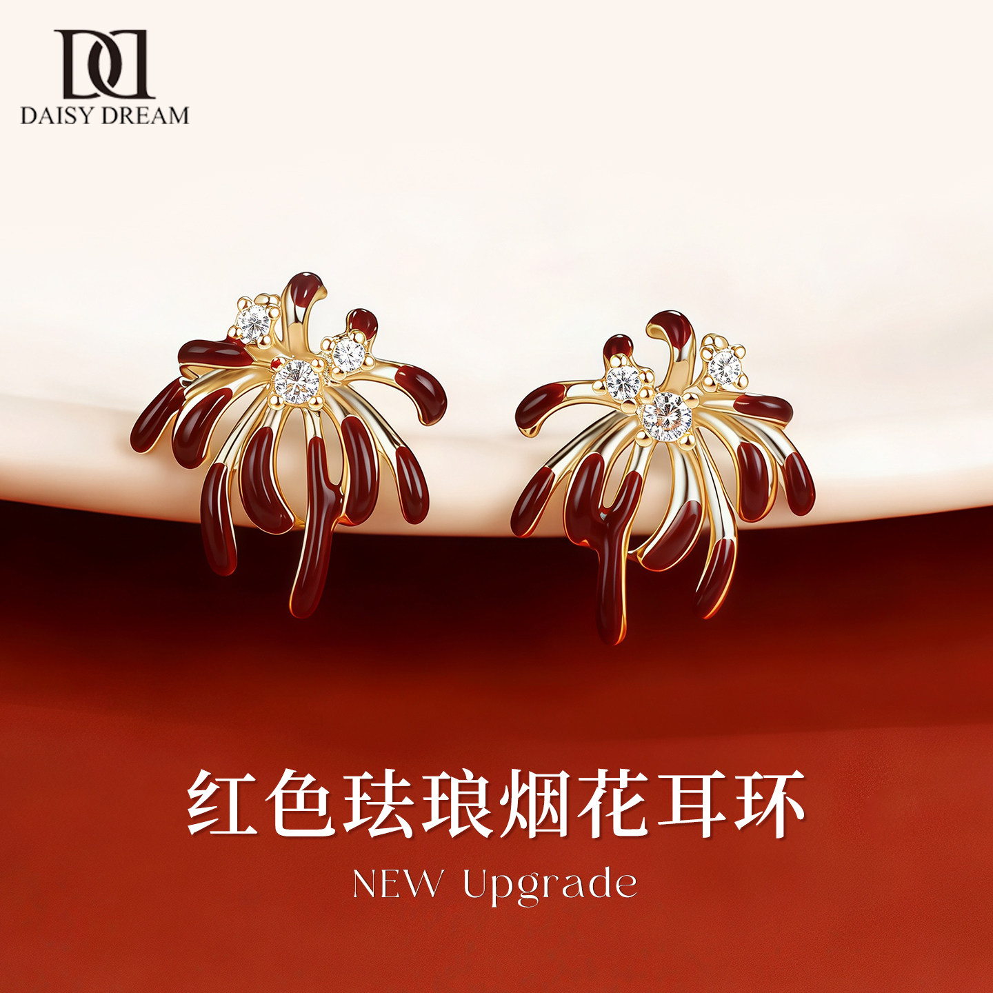 红色珐琅烟花新年耳环女新款小众纯银针耳钉轻奢高级感气质耳饰品