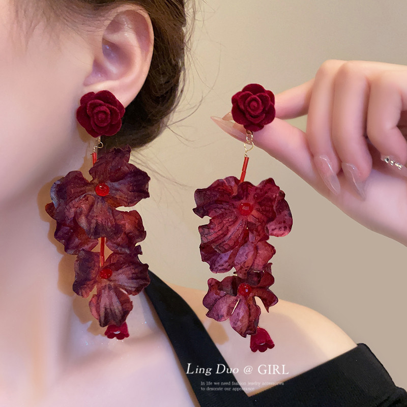 纯银耳钉红色玫瑰长款复古夸张度假风氛围感海边耳环晨袍耳饰超仙