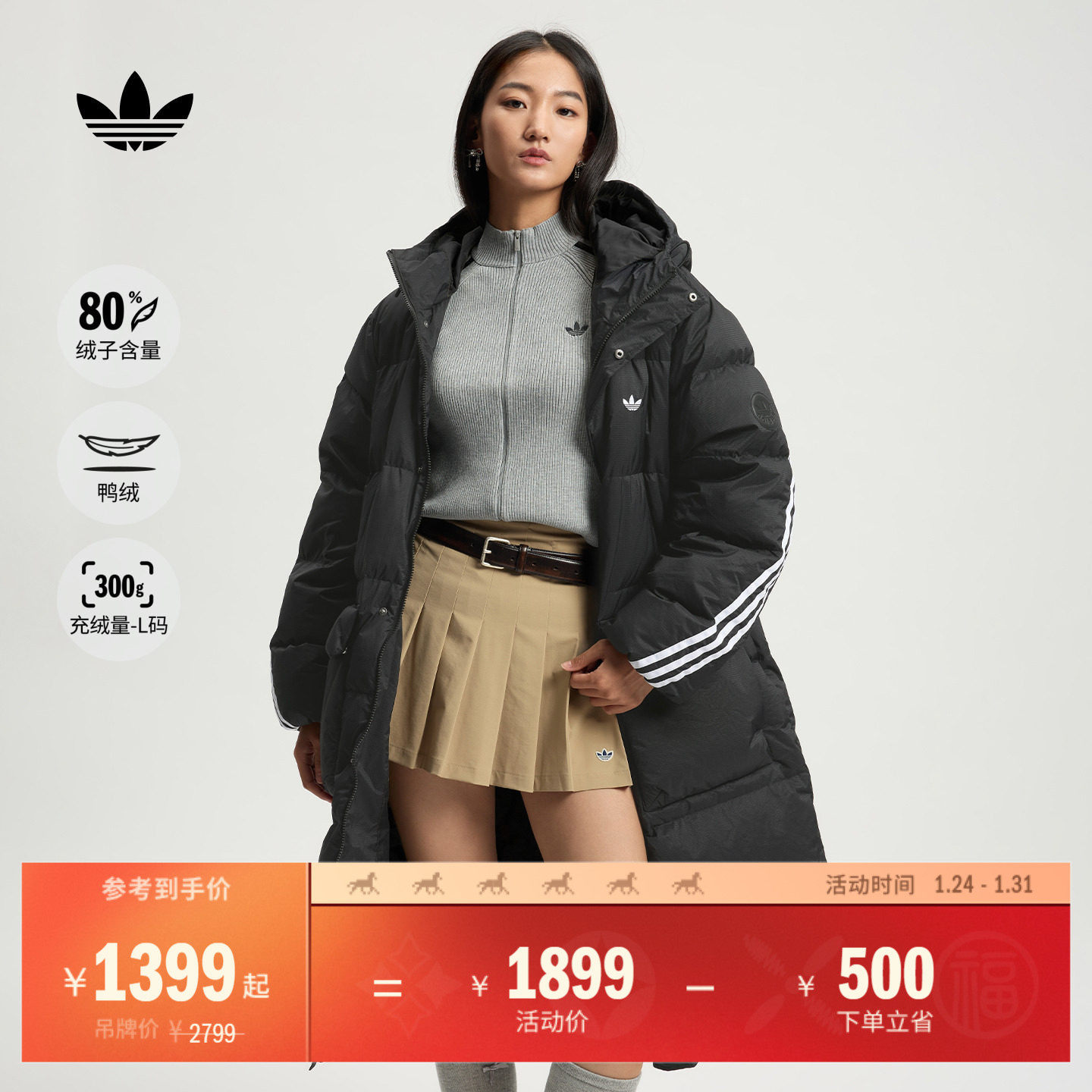 保暖宽松舒适长款三条纹鸭绒连帽羽绒服男女adidas阿迪达斯三叶草