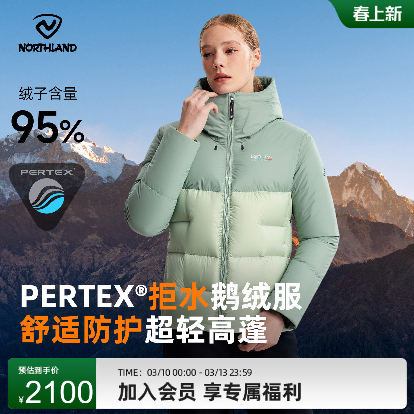 NORTHLAND诺诗兰鹅绒服PERTEX超轻高蓬拒水羽绒服男女同款保暖