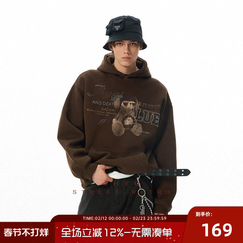 JHYQ净化眼球春秋美式400G重磅小熊钉珠印花连帽卫衣男宽松情侣衫