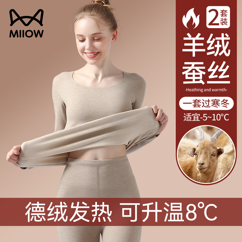 猫人羊绒秋衣秋裤套装女士德绒发热保暖内衣女款加绒加厚打底冬季