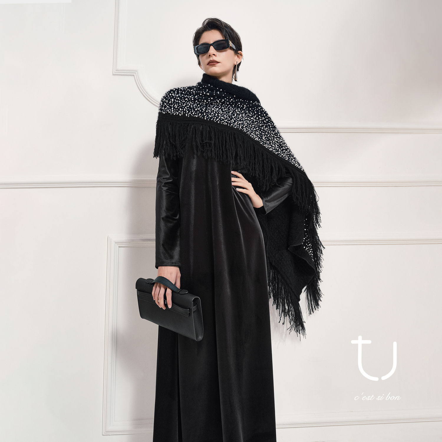 TU女装 阿芙洛诗 可拆卸狐狸毛领连衣裙25冬季新款醋酸丝绒长裙子