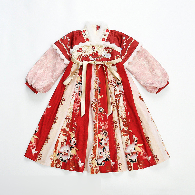 红色新年中式明制马面裙2025加厚汉服女童毛毛领连衣裙唐装拜年服