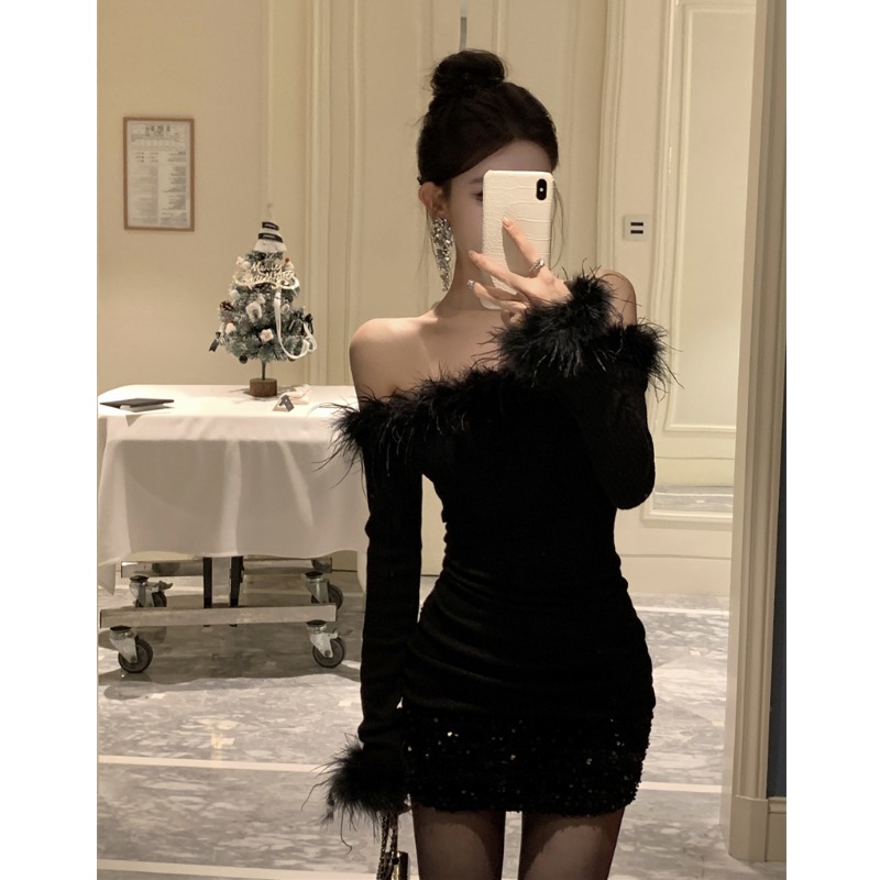 圣诞氛围感秋冬黑色辣妹毛毛领一字肩连衣裙女内搭性感显瘦包臀裙