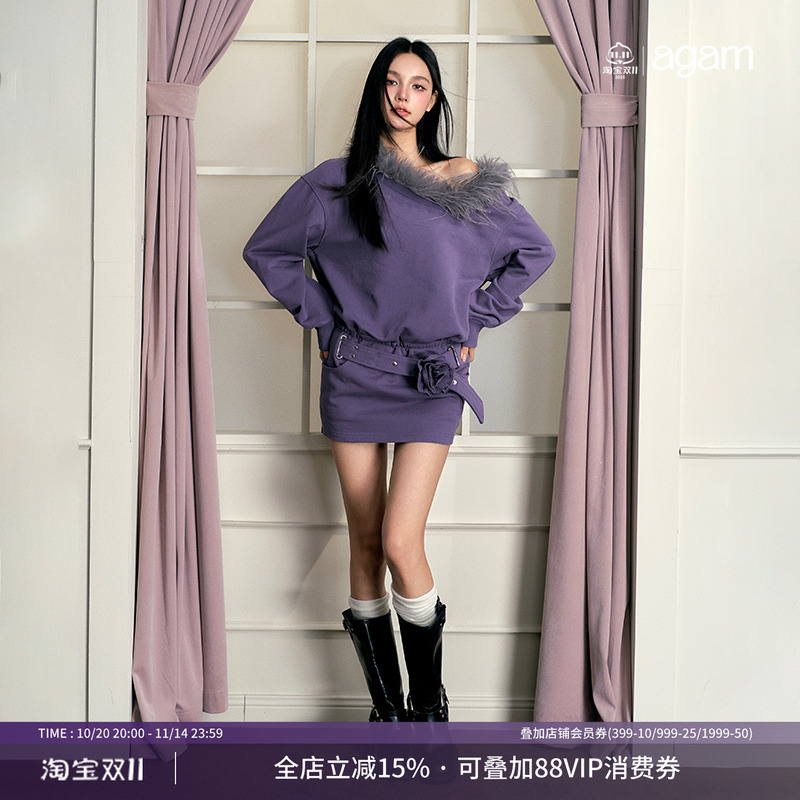 AGAM 原创露肩毛毛领卫衣裙拼接直身设计纯欲玫瑰花腰带连衣裙女