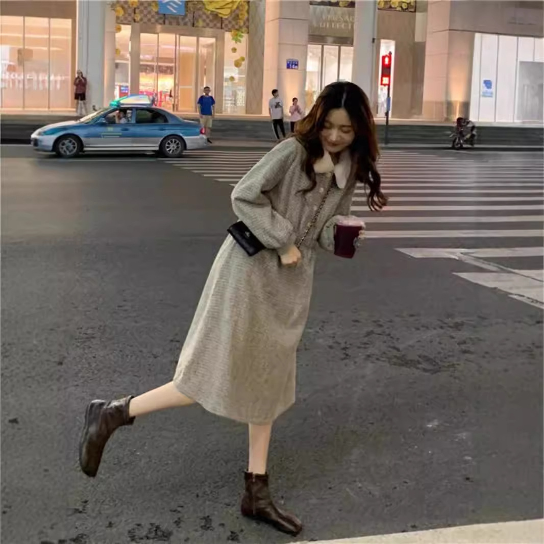 法式复古毛呢翻毛领连衣裙女秋冬季收腰显瘦温柔风a字中长款裙子