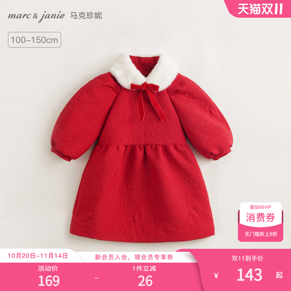 马克珍妮女童新中式仿兔毛毛领连衣裙 儿童新年红裙子冬装231330