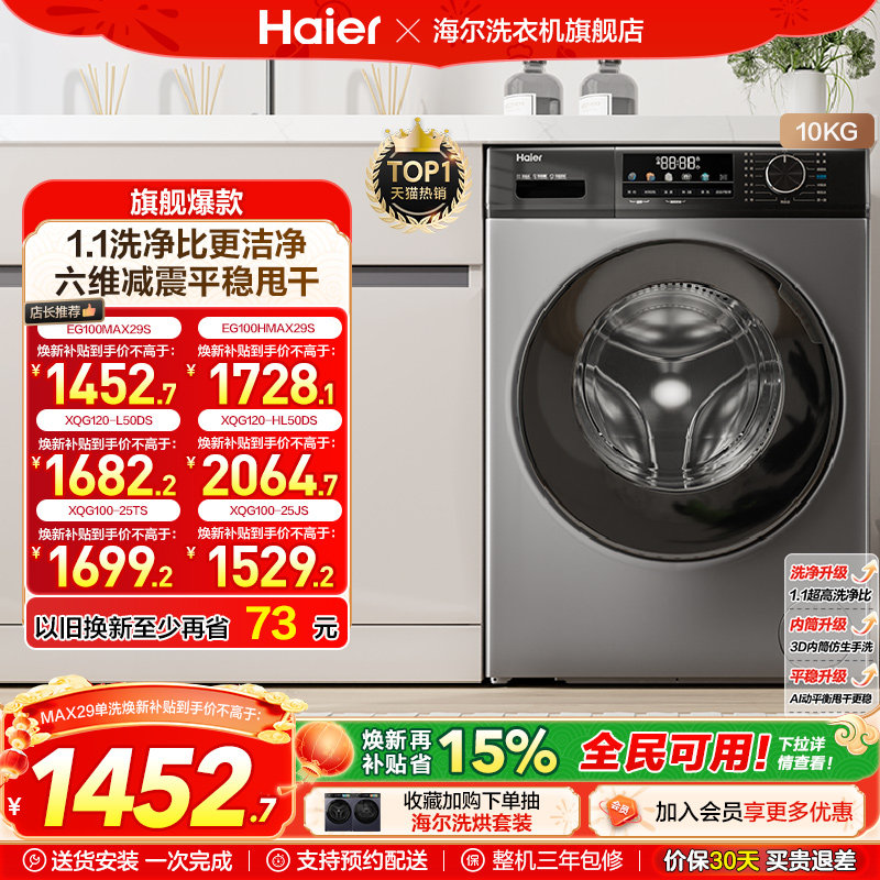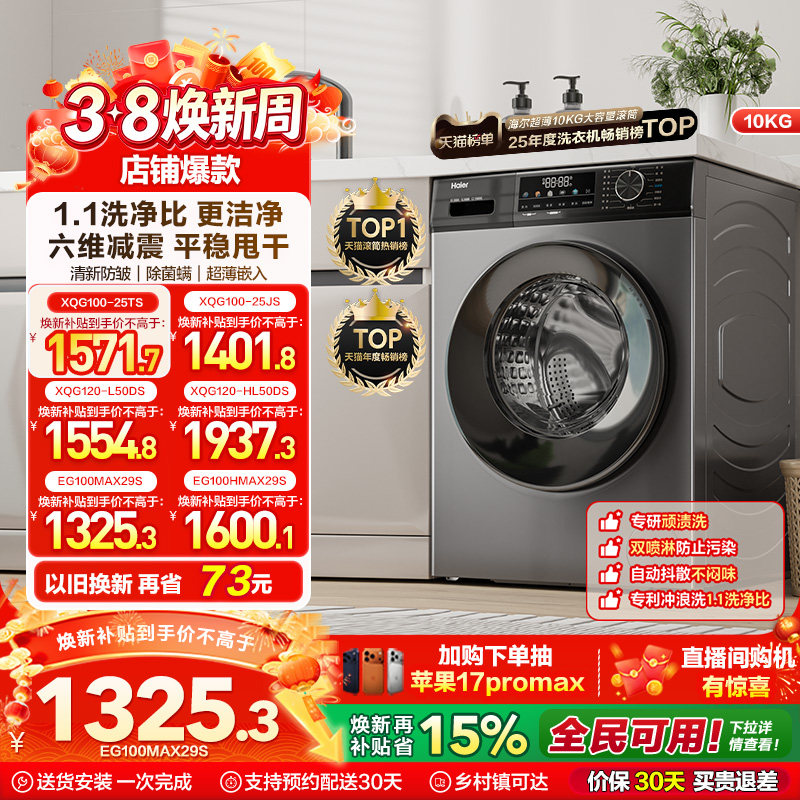 【国补15%】海尔滚筒洗衣机家用全自动超薄10kg大容量洗烘MAX29