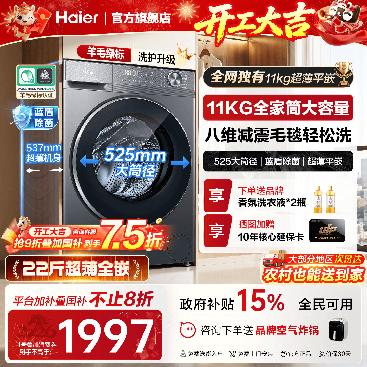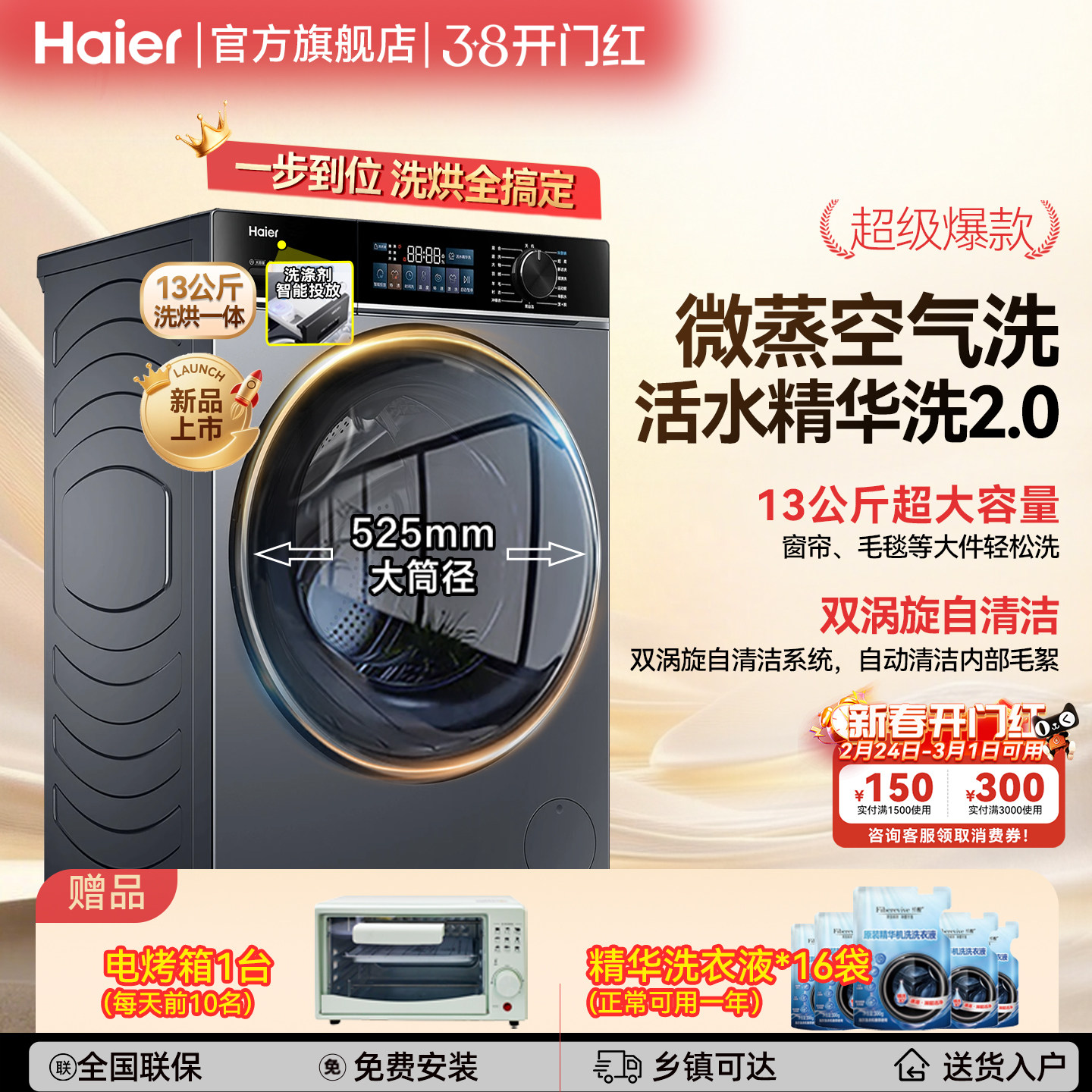 补贴海尔13公斤大容量洗衣机全自动滚筒洗烘一体精华洗H53E旗舰店