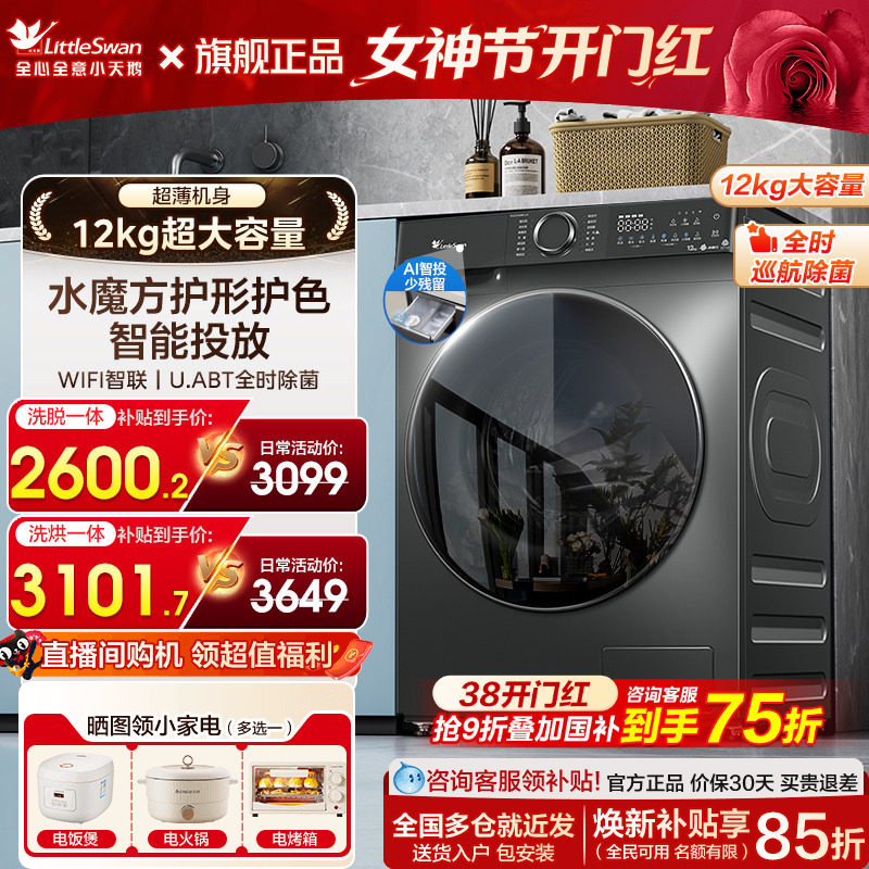以旧换新小天鹅洗衣机10/12kg全自动家用滚筒洗烘脱一体机098/28T