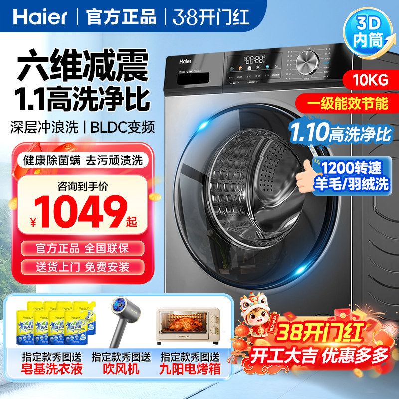 海尔滚筒洗衣机全自动10公斤大容量变频除菌一级节能变频洗脱一体