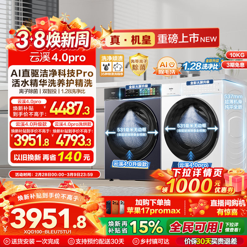 [云溪4.0 pro]海尔滚筒洗衣机直驱全自动大容量洗脱75DW