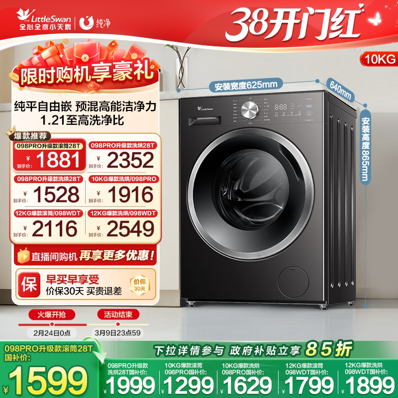 [除菌]小天鹅洗衣机家用全自动滚筒10kg洗衣机洗脱一体机098pro