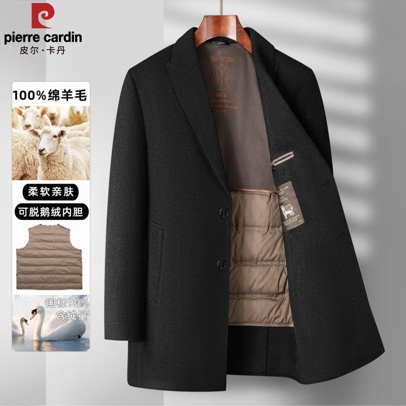 皮尔卡丹中长款纯羊毛大衣男款中老年羽绒内胆高级感毛呢外套冬季