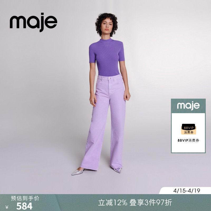 Maje春夏女装法式简约时尚半高领多巴胺紫色短袖修身针织T恤上衣