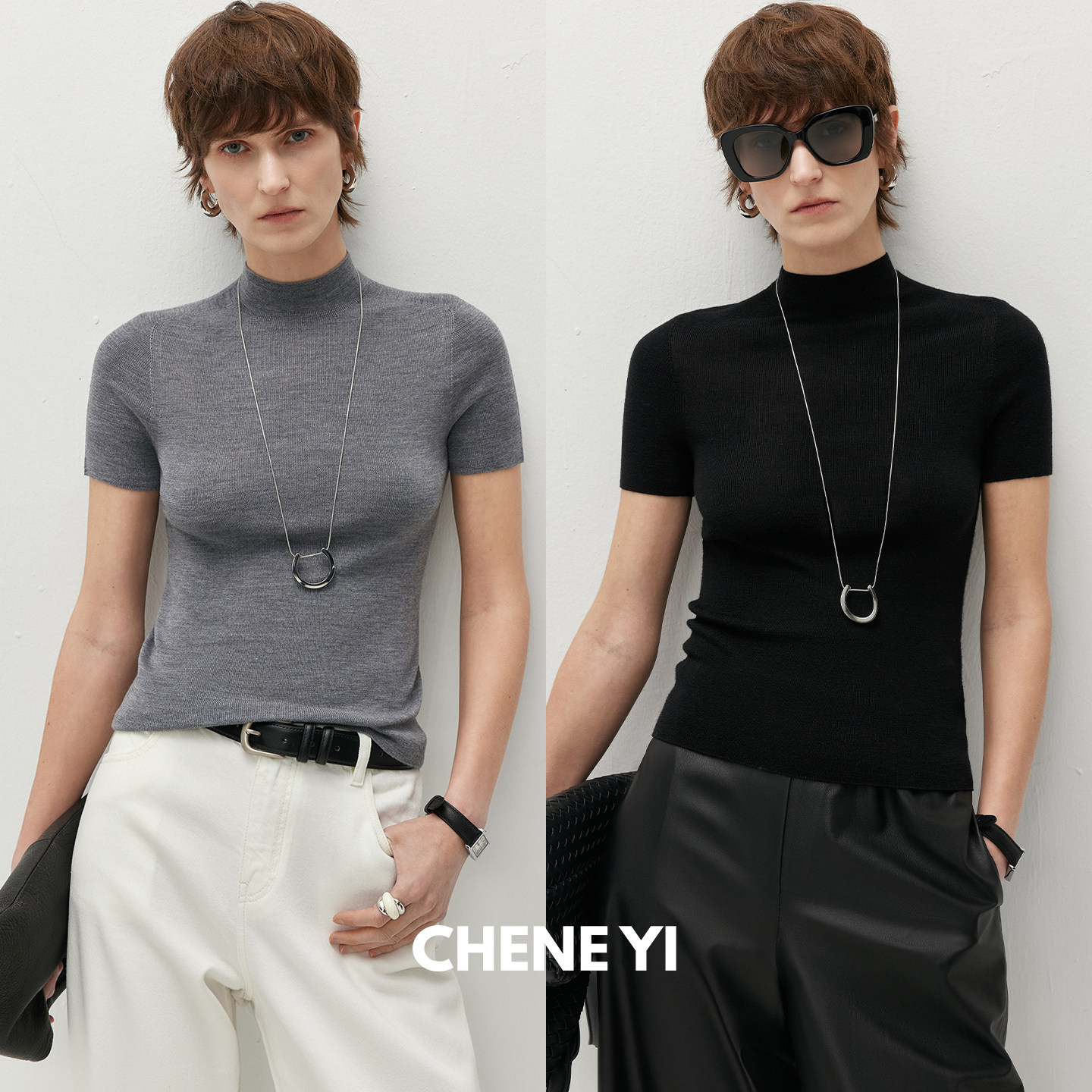 CHENE YI 真丝羊毛混纺半高领修身弹力短袖无缝针织衫上衣T恤女